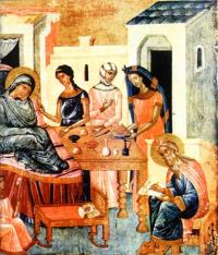 Настало время, и святая Елисавета родила сына, все родственники и друзья радовались вместе с ней. На восьмой день по закону Моисееву совершилось его обрезание. Мать назвала его Иоанном. Все были удивлены, так как никто в их роде не носил этого имени. Когда спросили об этом святого Захарию, он попросил дощечку и написал на ней: «Иоанн имя ему» – и тотчас связывавшие по предсказанию Архангела его речь узы разрешились, и святой Захария, исполнившись Духа Святого, прославил Бога и произнес пророческие слова о Явившемся в мир Мессии и о своем сыне Иоанне – Предтече Господа.